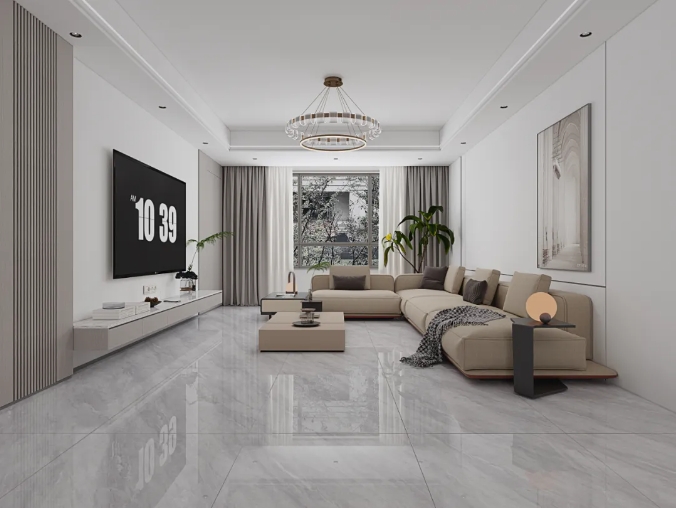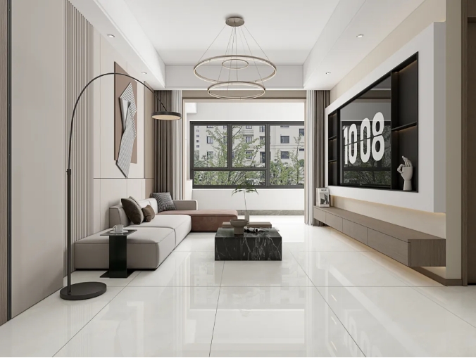 極簡的素色客廳中,冰瑩玉瓷磚如凝霜鋪地,清冽的紋理與大地色軟裝相映,綠植點綴間,冷調空間盡顯溫馨與自然。
